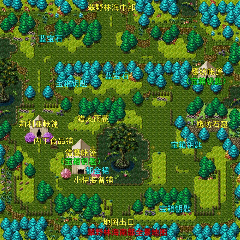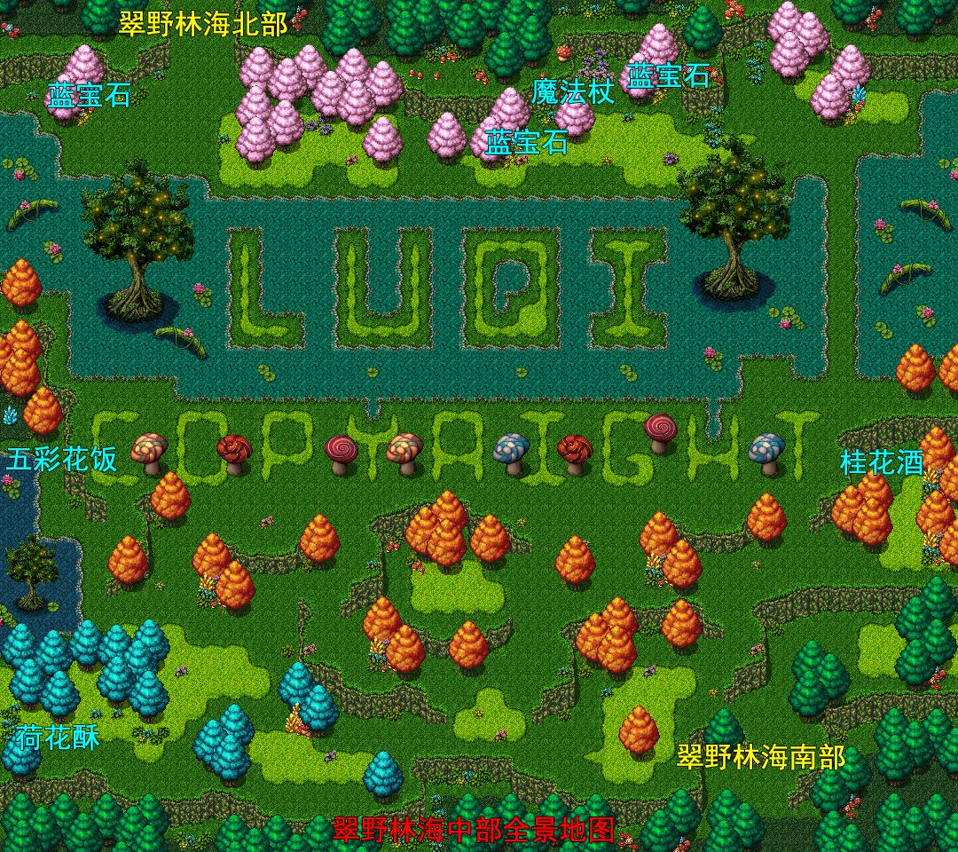 往右,发现“蓝宝石”x2,使用宝箱钥匙得到“魔法杖”(密檐可以装备,物攻+4,魔攻+12),往下走右下角宝箱得到“桂花酒”(单人永久增加3点幸运)。 暂时别往下走,因为一旦走到翠野林海南部便无法回头,往左走,上下两个宝箱分别得到“五彩花饭”,“荷花酥”(单人永久增加3点敏捷)