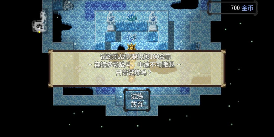 回到左上角进入内室,迎面可以看到金色的女神像。【女神像可以选择祭拜,恢复所有HP,MP。选择试炼,进行多场战斗,可提升角色经验,等级,当野外无怪可杀的情况下,只能依靠女神像来进行升级。】