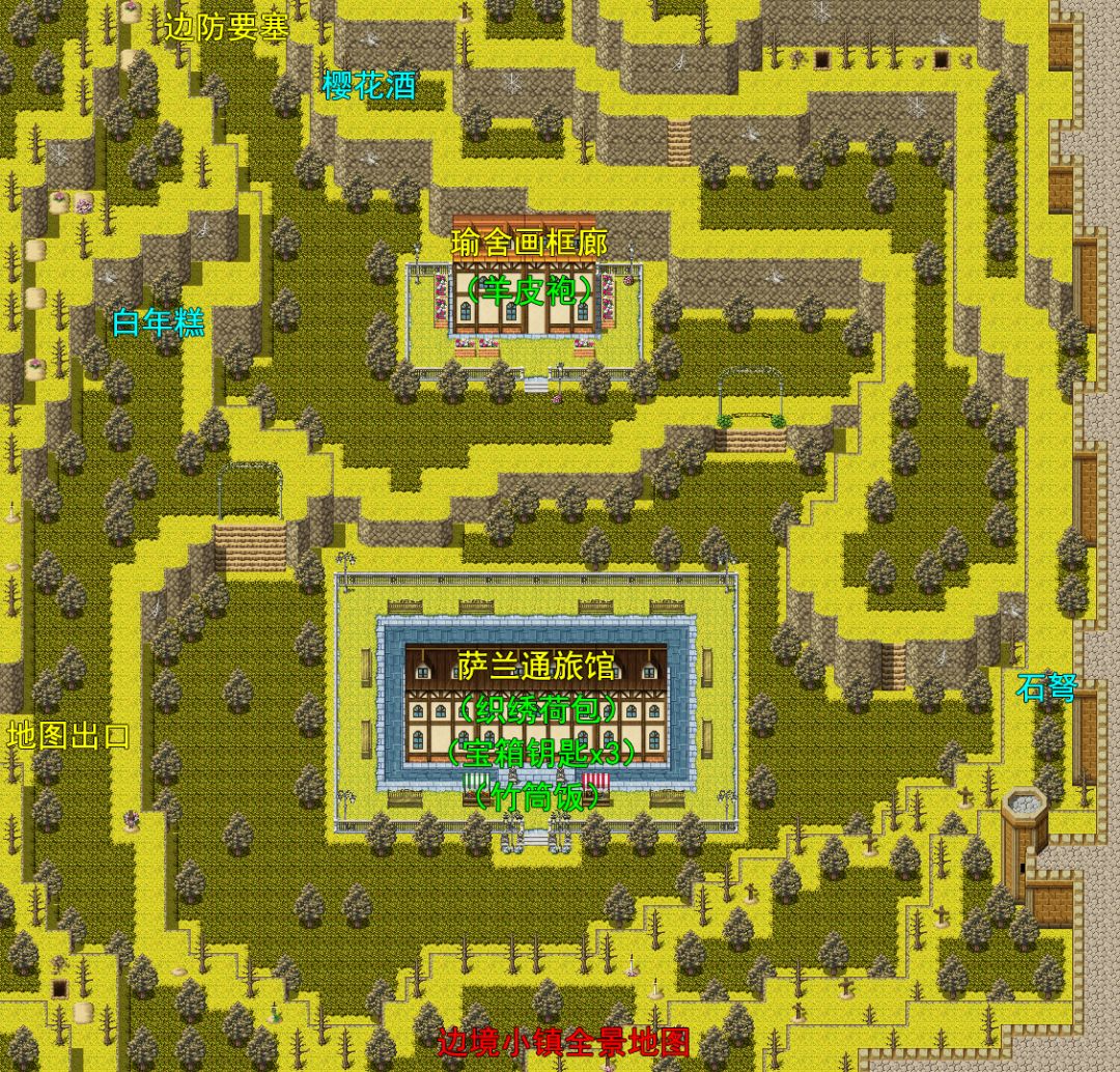 往南进入边境小镇,在第一间房子里找到“宝箱钥匙”x1。往右在使用宝箱钥匙得到“石弩”。绕出来发现一个宝箱得到“樱花酒”。
