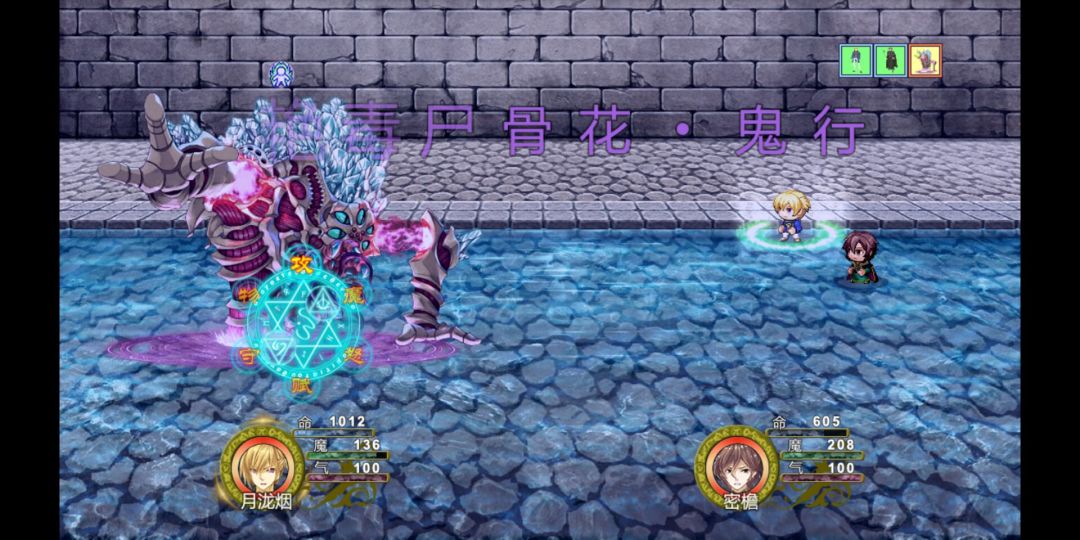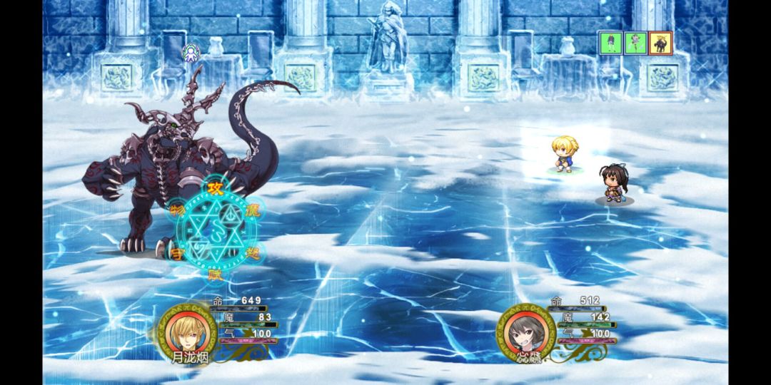 往上右边有一个宝箱,此时我的钥匙已经用完了,所以存档,强行开箱满足一下自己的好奇心,扣除全队魔法攻击-1,得到“棉布袄”,物防和魔防各加4点。价值不大,放弃,读档,直接攻击此章的BOSS,九冷兽。轻松击败后得到“长命玉锁”,男性配饰,佩戴者可增加10%生命上限。
