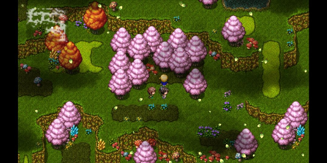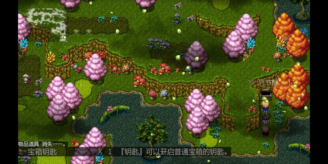 入口处右边水塘边得到“蓝宝石”x1。往下走宝箱得到“樱花酒”x1。往下走树下得到“蓝宝石”x1。右下方角落里有上锁宝箱,使用宝箱钥匙后得到“竹节鞭”(惢飛可装备,物攻+11,敏捷+5)