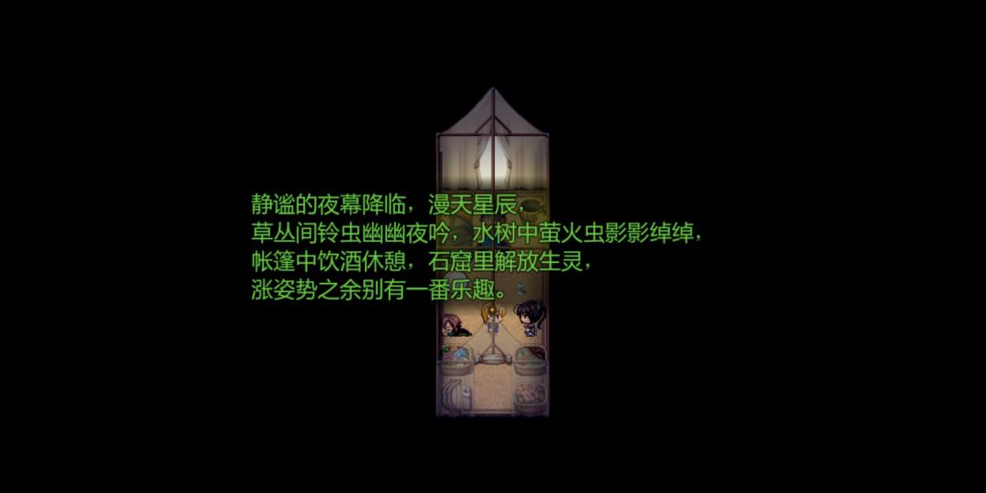 一番苦战后,得到诸多宝物。得到战利品“玳瑁犀角”(男性配饰,濒死-50%,每回合自动回复1%HP),“镂空叶指甲套”(女性配饰,药理知识+50%)胜利之后的主角二人,返回到牧场,得知已经释放所有鹰隼的吹笛少年喜笑颜开,送上了小礼物,(恢复类道具三个)。返回帐篷后天还没亮,密檐一直睡的呼声大作,二人困倦袭来,再次合被而眠。