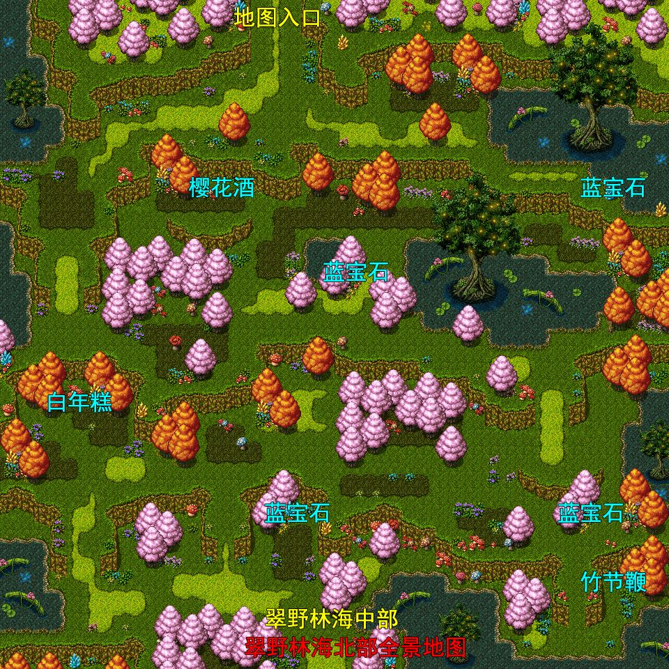 往左走,宝箱得到“白年糕”(增加单人永久4点魔防),在进入林海中部入口上方发现“蓝宝石”x1。 进入翠野林海中部,左边发现“蓝宝石”x1。右边再次发现蜂巢。 (此处地图含有隐藏彩蛋+1)