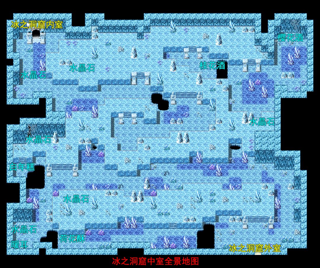 进入中室,上楼梯,搜索得到“水晶石”x1,往左下楼梯,宝箱得到“荷花酥”(永久提升3点敏捷)。回到门口,绕行往左下角得到“水晶石”x1。使用钥匙得到宝箱“暖耳”(女性角色装备)。继续往上得到“水晶石”x1,宝箱得到“白年糕”(永久提升4点魔防)。