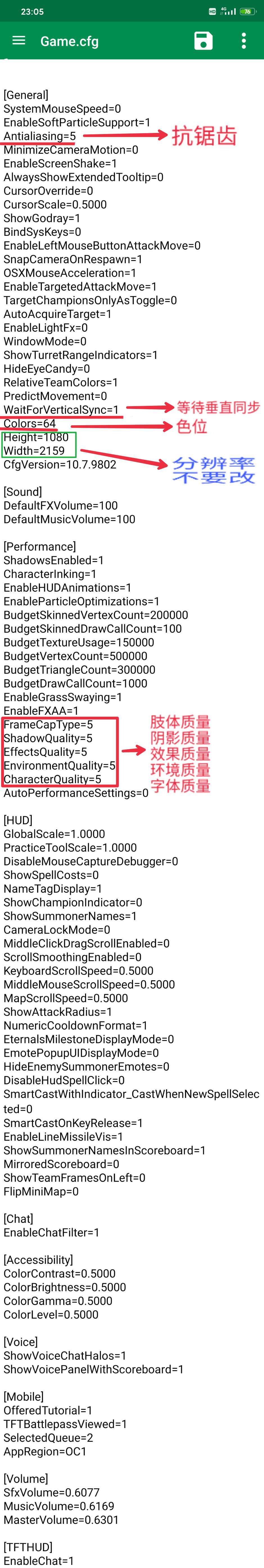 【前两天下载了云顶手游 可是发现画质比较辣眼睛 我不怎么玩手游适应不来】 分割线┈┈┈┈┈┈┈┈┈┈进入正题! ①:打开任意可编辑cfg或txt格式的软件 ②:进入TFT游戏设置文件所在目录(Android/data/com.riotgames.league.teamfighttactics/files/Documents/Config/Game.cfg) ③:编辑Game.cfg文件【等号后面数字:0为是,1为否(画质设置项除外)】,按照下图所示修改,然后保存修改即可。 Tips:其他想改的可以自己修改,翻译是微软翻译的,不是很准确,大概意思都能懂(都怪当初没学好英语)。 [滑稽]二:直接替换游戏设置文件,文件链接:http://t.cn/A6Z3rm2h ①:打开手机自带文件管理,把下载好的文件剪切至所在目录:Android/data/com.riotgames.league.teamfighttactics/files/Documents/Config ②:删除原有文件(Game.cfg),再把剪切进去的文件后缀txt修改为cfg即可。 ③:我的手机分辨率为2159×1080,如果你的分辨率不是,可能游戏会打不开,那就把分辨率设置项修改为你手机分辨率,不过我也不清楚,没试过。。 分割线┈┈┈┈┈┈┈┈┈┈不想废话了!完!