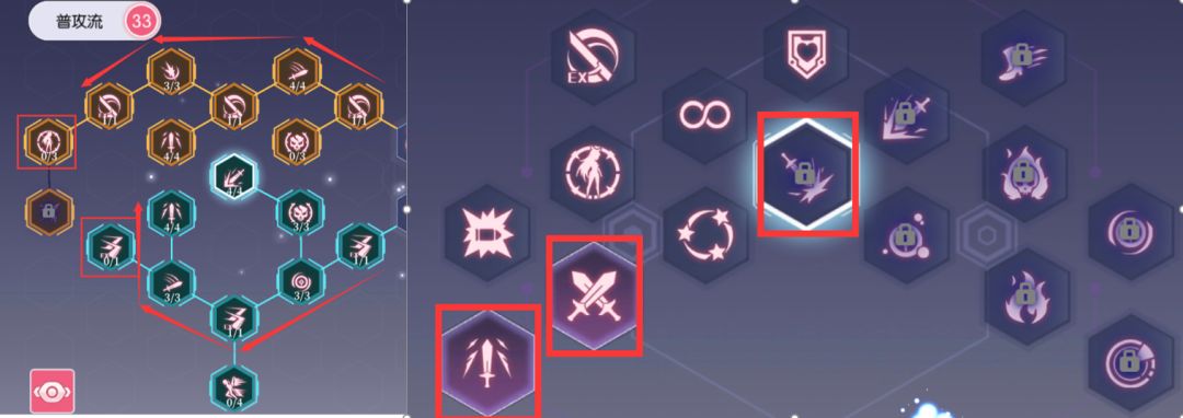在普攻流里面,两个终极技能都是15点消耗而加强在攻击范围,面对单体敌人(比如各种boss)的情况下,这个一共30点的技能点如果加成在其他敌方的话,收益就直接体现出来了。其他比如,对精灵伤害加成,穿甲等,都可以根据具体情况选点。