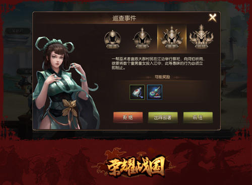 每次主公接取随机巡查事件之时,都会有普通、困难、噩梦、地狱四个难度可供选择,这时候就需要各位主公审时度势,根据自身实力出动军队进行挑战,难度越高挑战成功后给予的奖励就越丰富。巡查事件不仅仅是一次解决民生的要事,也是主公们历练军队挑战自我的好机会,需谨慎对待牢牢把握!