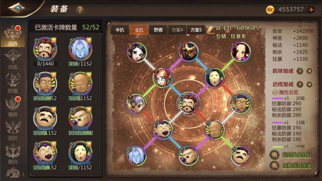 1.战阵必带全抗战阵,如图,这个是老线,大家新调整的推荐全堆防御!!经济条件有限的也要选择堆3条边线的防御(紫色必带四条线)紫色是三属性防御都加所以很重要,建议选择蓝卡与蓝卡之间出紫线,这