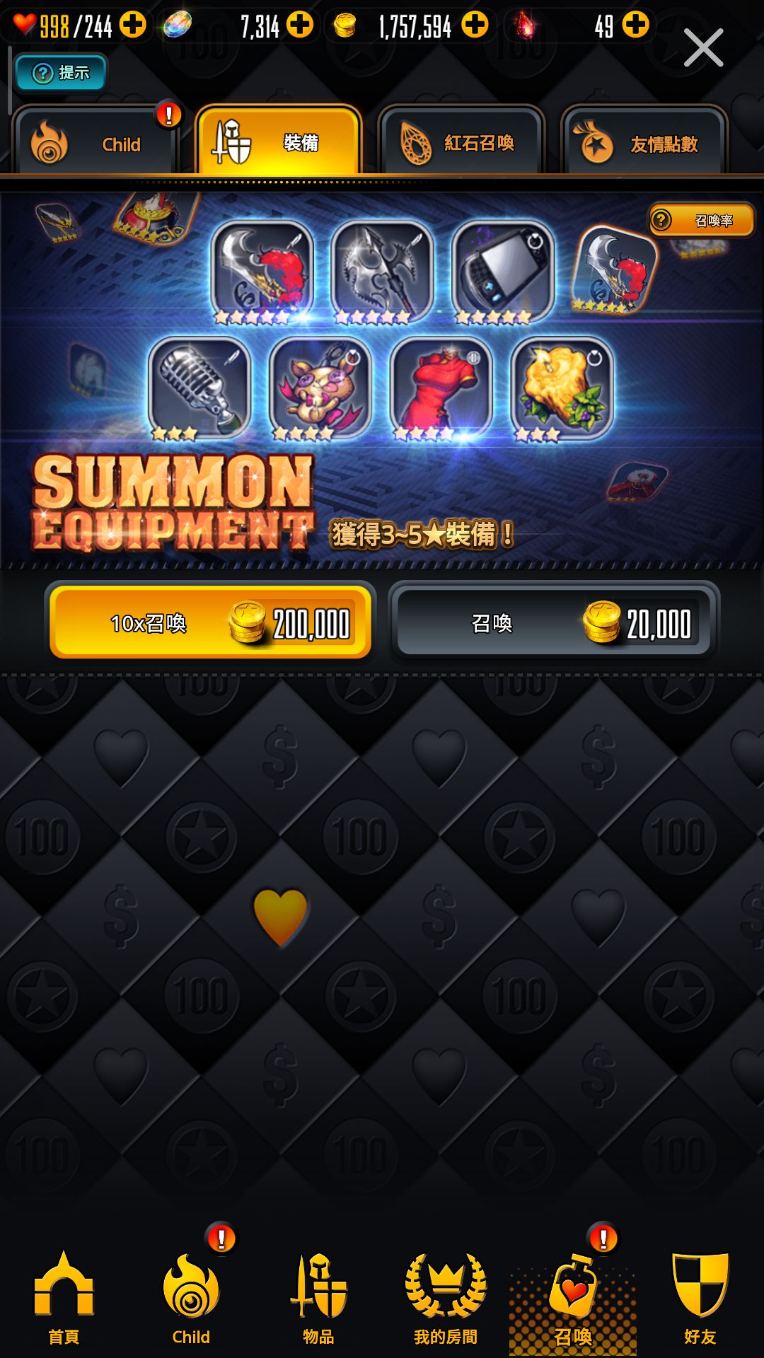 金币十连分天子和装备,这里不推荐新手玩家抽金币十连,因为你的金币日常使用都入不敷出,装备十连是谁都不推荐(坑爹设定)。