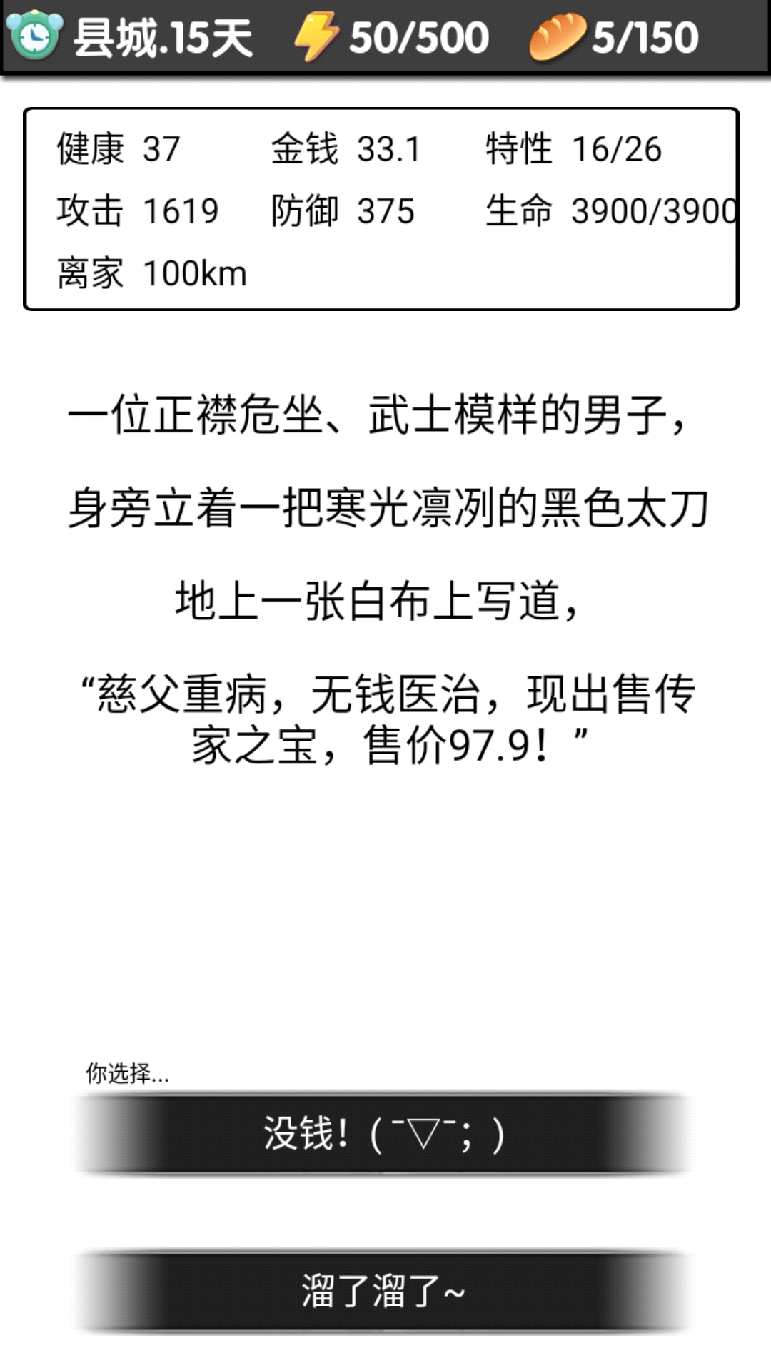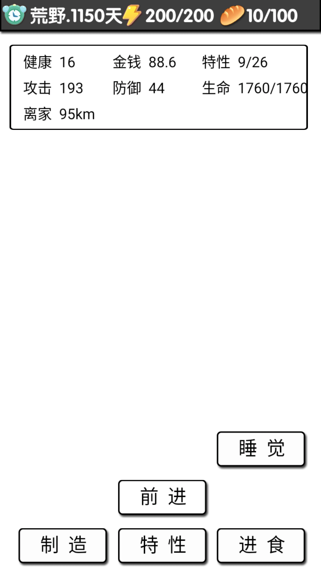 我玩了3次第一次正常玩最后通关了!第二把玩极限烟鬼流,15天就无敌!后来玩了把无限睡觉流,到1003天会触发县城剧情!那时我已经无敌了700多健康!下面附上