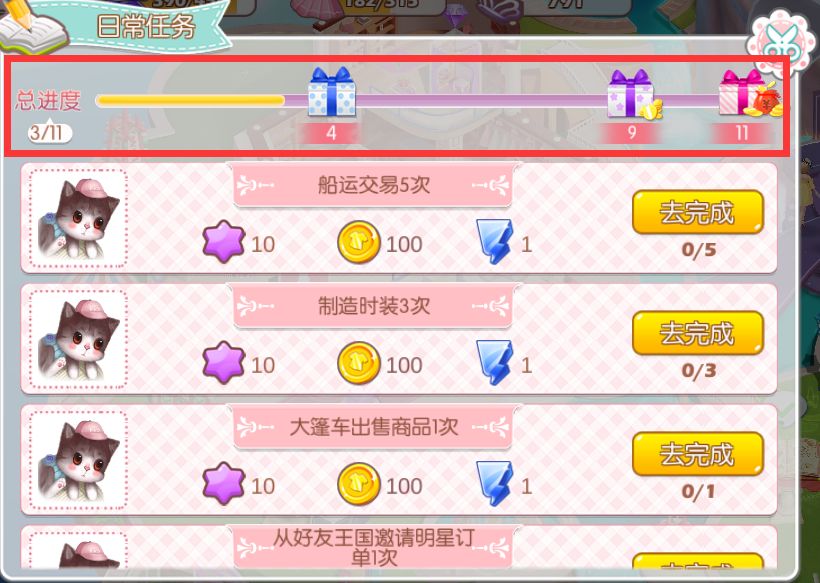 看到小跟班标记的红框框了嘛,这就是日常的进度条哦。黄色部分表示已完成进度,紫色部分代表还没完成啦。