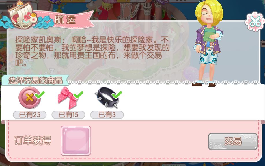 “船运交易5次”:没错就是游戏界面最右边那条船,这时需要准备足够的布料(神奇瀑布自动产出)来换取对应的物品,比如纽扣、蝴蝶结等(随等级升高解锁更多种类)。