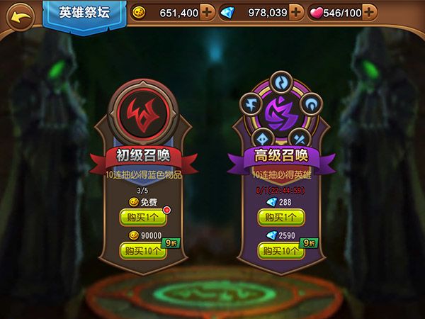 玩家首先需要了解的就是英雄卡牌的获取方式,在《刀塔无敌》中英雄卡牌主要通过英雄祭坛直接抽取,每次抽取不仅有几率直接获得英雄卡牌,同时还有一定几率获得游戏道具。除了英雄祭坛抽取之外,玩家也可以在游戏中参与各种娱乐功能和活动,活动会随机奖励玩家英雄灵魂石,当你收集齐全某一英雄的灵魂石后,即可进行召唤。