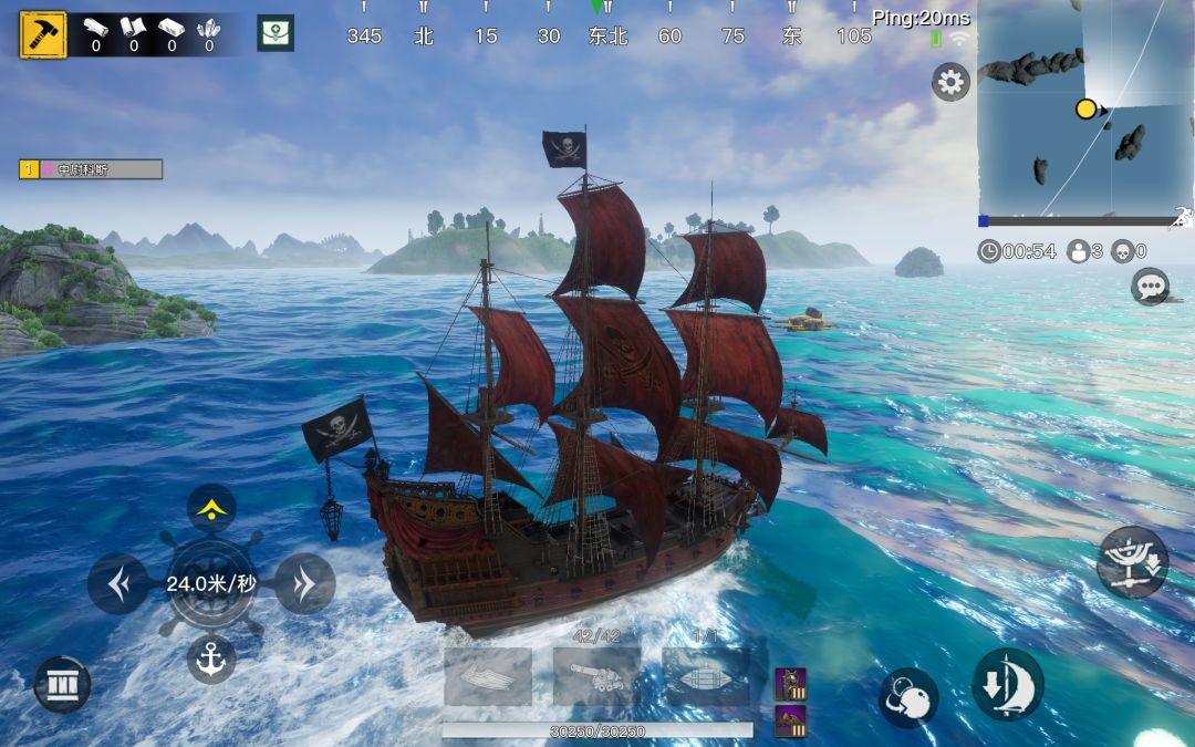 从岛屿出航,或者直接跳伞落至海面后,大家就可以在海面上尽情航行了。通过左侧的方向按钮和右侧的降半帆、收帆按钮,可以控制舰船的方向和移速。