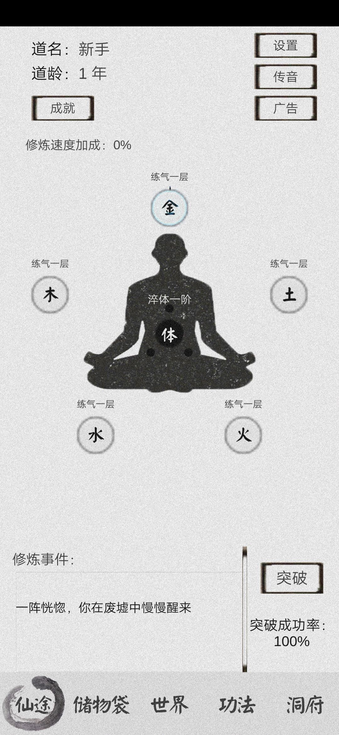 进入游戏以后会得到一本金系功法,自动获得修为,满了就点突破,一共有十层,如果不想修习金系功法,可通过刷第一个副本得各系功法修炼。淬体诀是炼体功法很重要,每突破一阶可增加血量和防御,副本次数最多可储存48次。(氪金大佬300次)