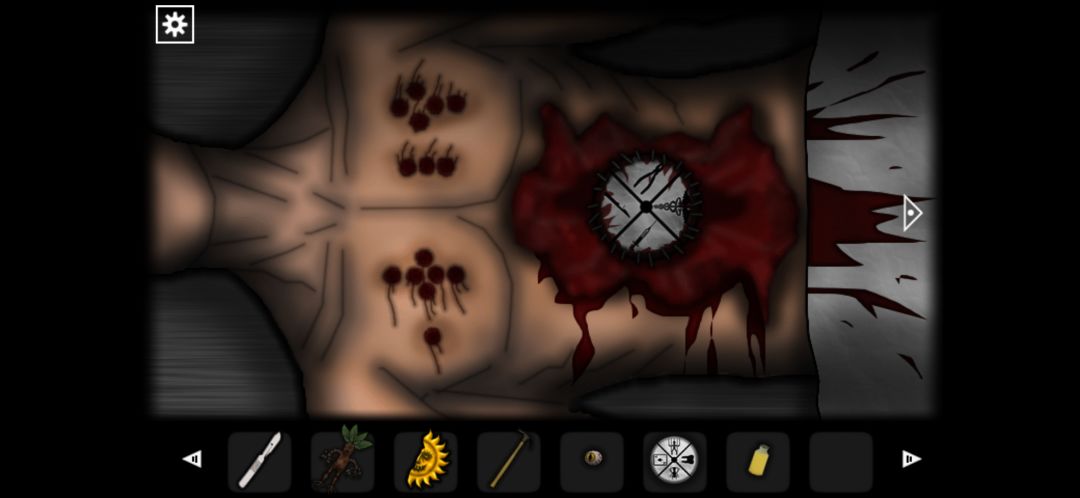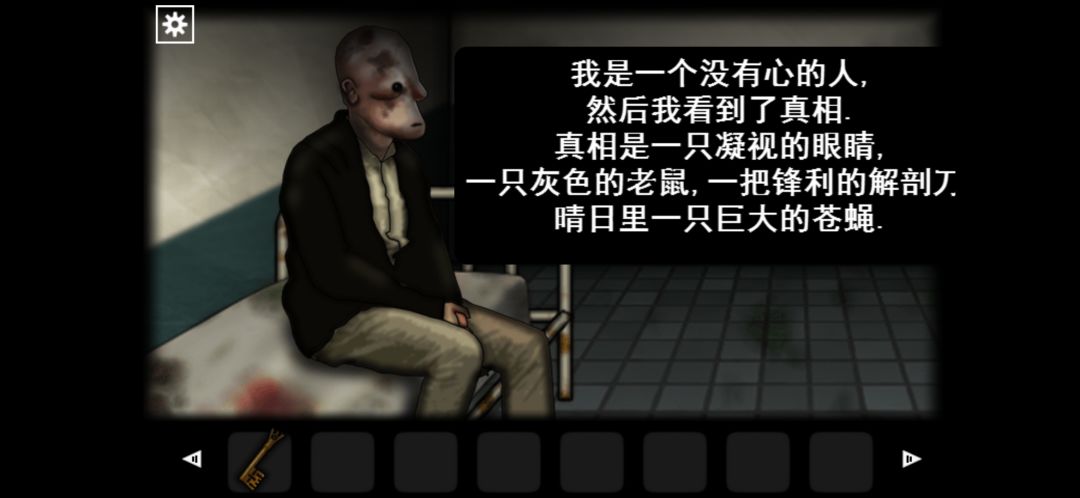 钥匙开触手房间里的门,刚进去手机会震动(你懂)。点他,用手术刀切开手术线,得到金属盘和胸口上线索。