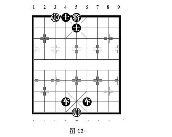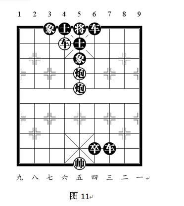黑将不能左右躲开,且在纵向上被重炮将军。无法垫将:垫将时,前炮可以杀将。如果无法吃掉后炮,或在两炮中间塞入棋子,则绝杀无解。变化型,如图11:图11