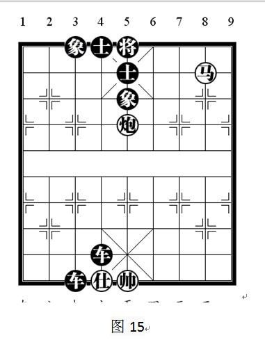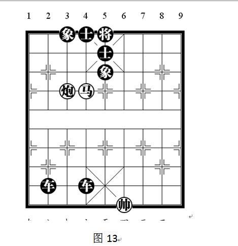 红炮利用黑士当炮架正在将军,由于黑4路士无法拆炮架应将,所以被将死。这种杀法称为“闷宫”杀法,有些地方也称为“背兜”杀法。变化型,如图13: