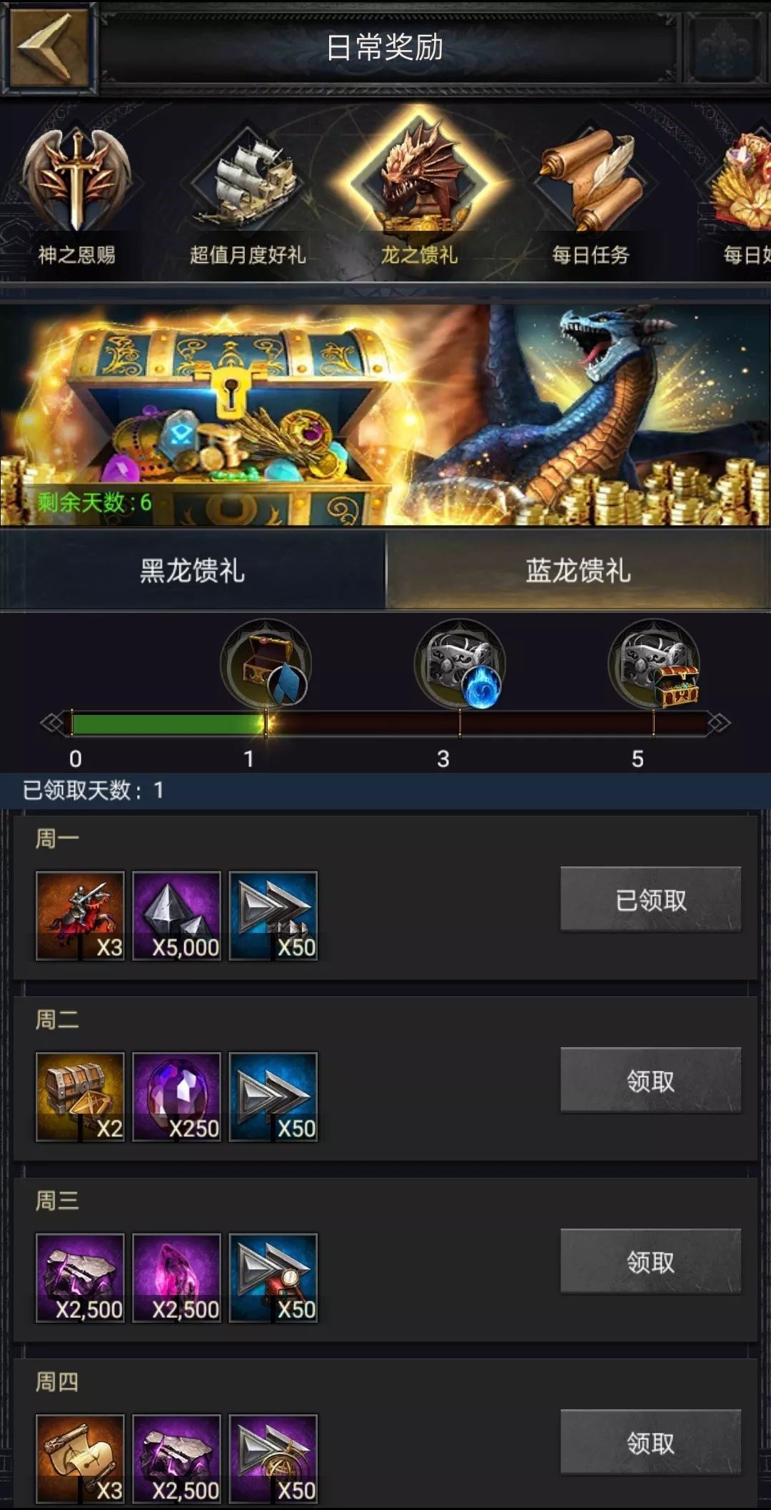 【活动内容】:在日常奖励-龙之馈礼页面上线全新蓝龙馈礼。购买蓝龙馈礼即可激活专属光环(7天),并可以连续领取7天超值奖励。包括:精铁、阵法手册、幸运石、水晶,贤者卷轴等等珍贵好礼。