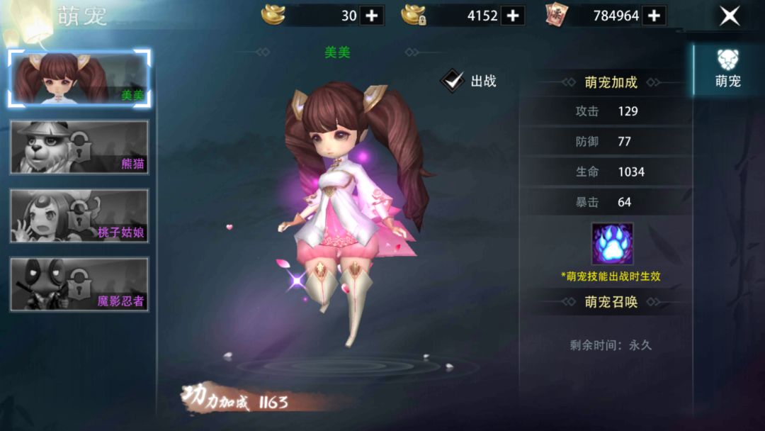 卖萌的小熊猫,当与敌人战斗的时候放只可爱的熊猫上去卖萌,敌人瞬间斗志剧降,是不是很有画面感呢?还能提供100%的野怪经验加成哦。