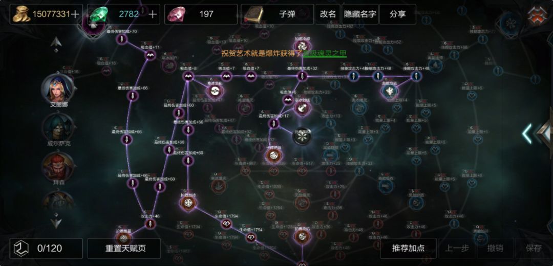 1.天赋选择:子弹法师天赋,不多bb,我直接上图,因为每个玩家对天赋树的理解都不一样,我也不多解释我的选择,其实这个东西大家觉得玩的舒服就好。第一套天赋在于攻守兼备,第二套天赋就比较暴力些,当然如果缺蓝自己点一下奥能吸收