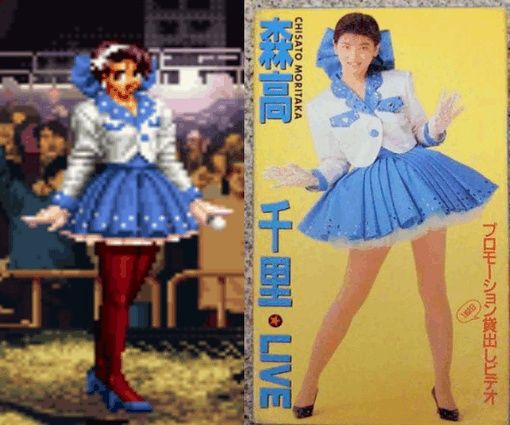 在《拳皇97中》麻宫雅典娜1P登场服装COS了森高千里《17才》的装束。