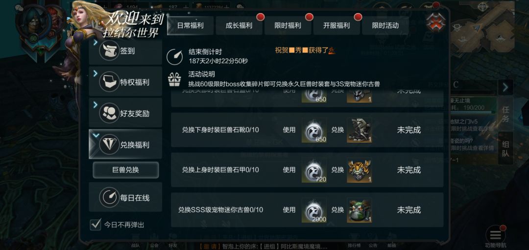 没错我又来了,第一次发了一篇关于收集换宠的帖子,那时候是每次打世界boss是掉落一个碎片,第二天更新了,很好更新以后掉落两个碎片,我真想问问策划你们更改数据的时候有没有动动脑子?麻烦动一动好不好,一出出了个半年的任务,187天一天掉落8个我还给你按200天算是1600个,我都醉了,没更新之前是800更新过之后是1600换宠需要2000我拜托你们做活动严谨一点,能不能想一想?咋?剩余那400是要购买?还是说补偿?一个活动出的能更改几次我也是醉了