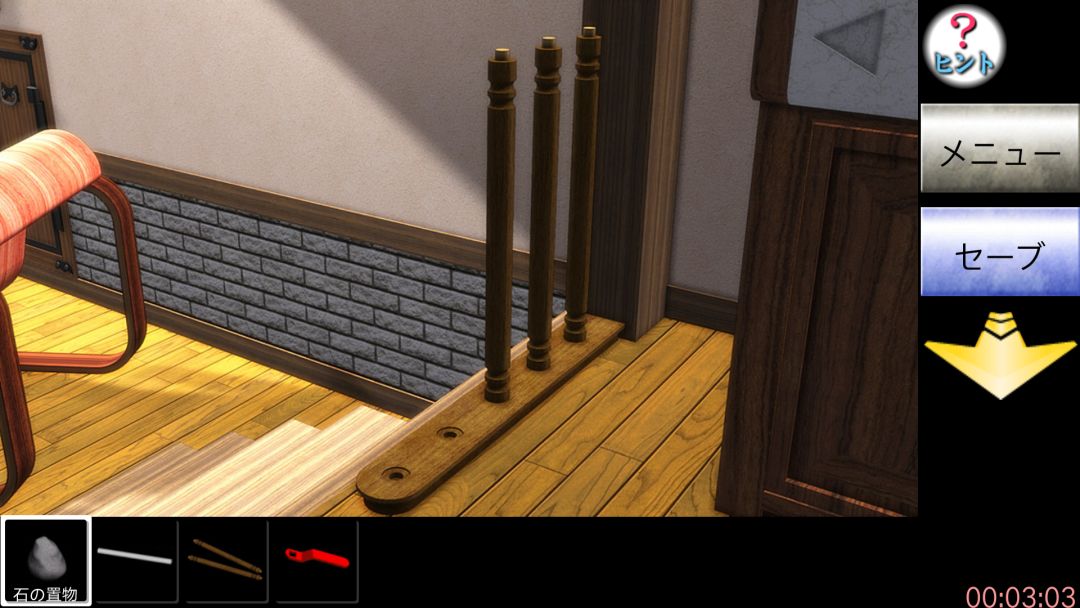 P为加法的英文开头字母,M为减法的英文开头字母,计算后得答案2017。去书桌那输入,左边的小门可以打开了依旧点第一层拿圆珠笔,后退往右划一次来到客厅,点右边墙上的网框,点网框对上面的插销用圆珠笔戳开拿到钳子,再点圆珠笔两次拆开,用钳子拿出笔身。后退往右划,用笔身把地上木板的钉子翘起,再用钳子拔掉钉子,拿到扳手,往右划回到书桌画面,点左边墙上画用扳手拿到画下铁棒,后退往左划一次点楼梯旁的木栏,可以拿到棍子,如图