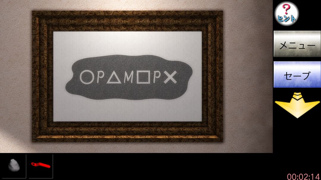 说完后进门,又是一段剧情后主角站在书桌前,点书桌上的茶杯再点它把手拿起,得到硬币,后退点书桌右边小门点开第一层抽屉得把手,点书桌右边的垃圾桶,里面拿纸屑,后退两次点左边墙上画得提示1:圆,方块,正方形,方块,圆。后退点右边墙的门按顺序点按钮再按ok,门打开得木块,后退点门上方木框,点木框底部可看到如图