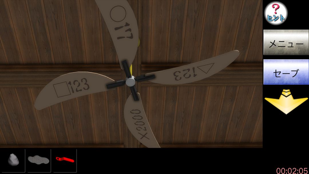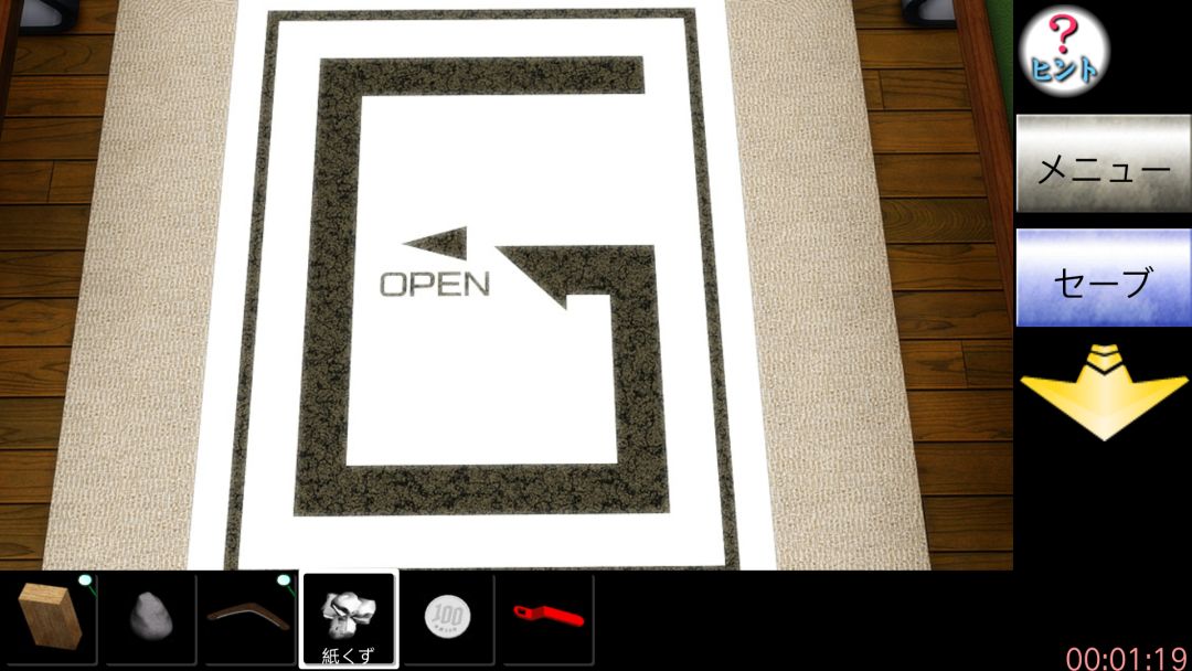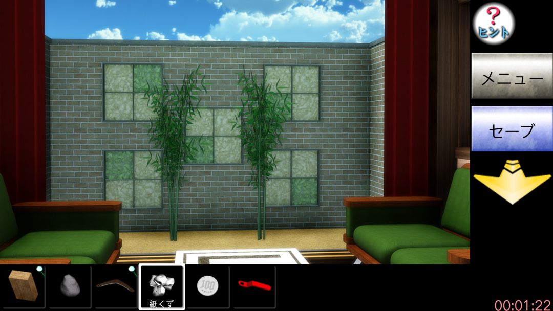 结合可知要按左下,右上,左上,右下,左下的顺序点沙发坐垫,点右边墙三角板那得绿色钥匙,后退观察三角间隙可看到英文WATER,点它左边的bank机,放入硬币输入英文得火柴。后退两次往左划点书桌左边的火炉,用绿色钥匙开锁,点木块放大用回旋镖上的刃切成木条,放进火炉再放进纸团当引燃物,用火柴点燃,等动画过后再对壁炉里的灰用回旋镖弄出来,后退点书桌再点左边蹦出的密码盘得知密码为4位数,后退点电风扇得图