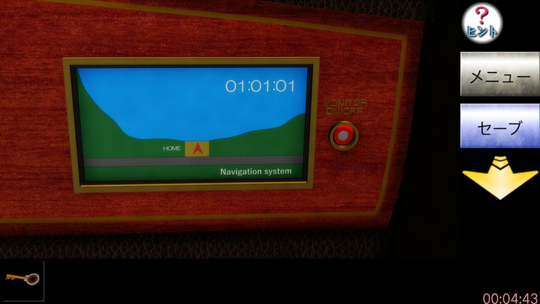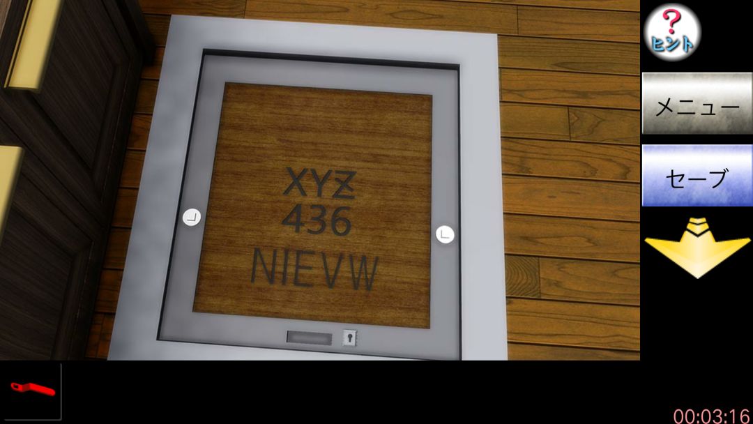 XYZ436是指X有四条杠(交叉点为起点),Y3条杠,图上的Z中间还有一条杠,故为6条杠可得NIEVW的数字为31524。点左边的柜子打开,点里面的墙剥开看到密码盘,根据上述顺序从1-5按最后按红色按钮得红色钥匙,后退一步对铁门用红钥匙,再对两边突出物用把手拧开,打开铁门下去。剧情过后,点墙上时钟可知时间:11:34:45,后退往右划,点左边楼梯下铁箱,再点它背后得帽子,后退两次,点洗手池上方的电闸点下排倒数第二个开关,后退点洗手池点按钮,用帽子接水,后退往左划对左边空白的画用水得提示大time+小time,下面抽屉开关开启,后退往右划两次再点船,先点红箱子再点箱子上方(即箱子和船的缝隙里有小抽屉钥匙),后退两次点船控制盘右边显示屏得新时间,如图