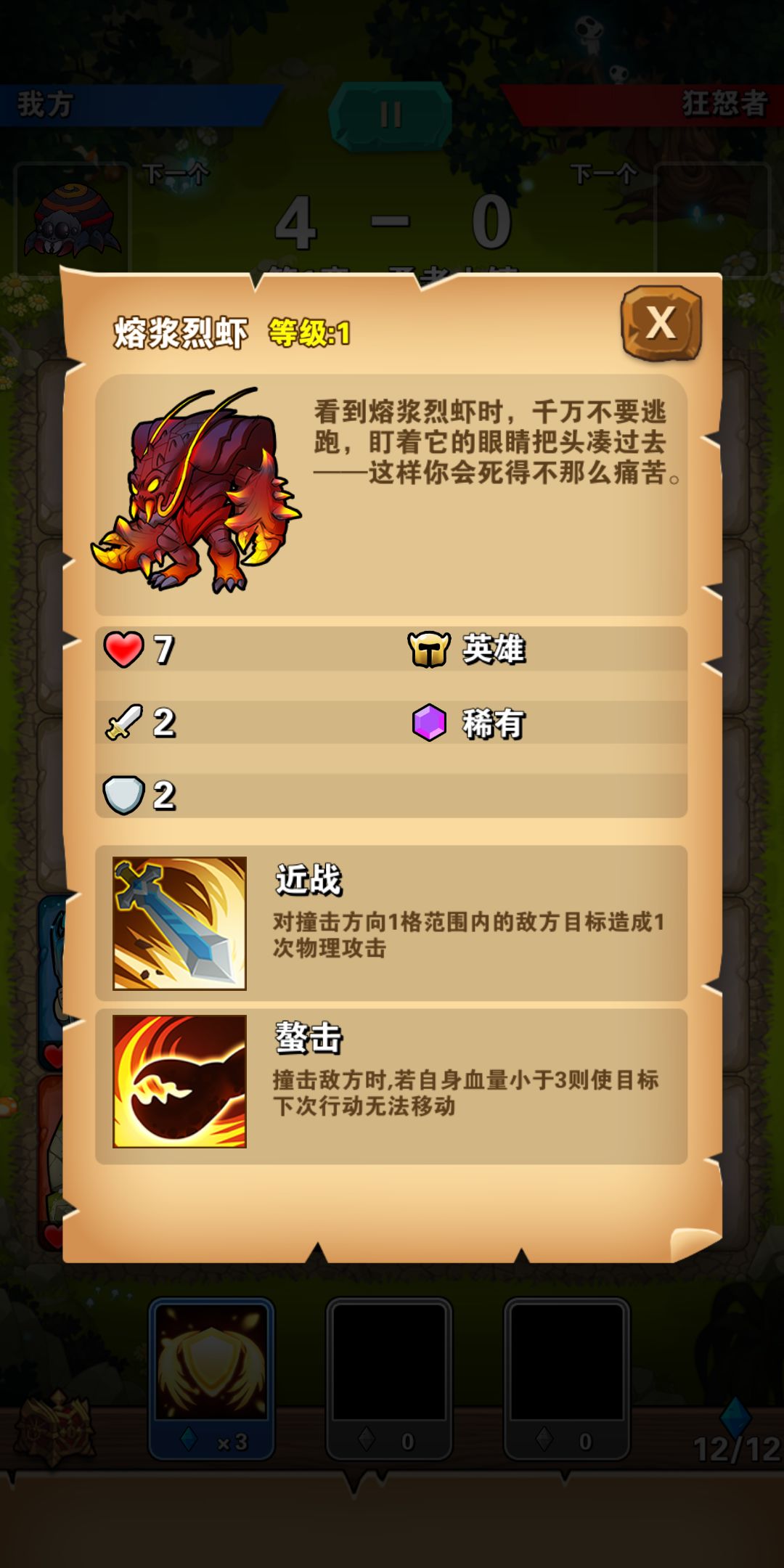 友情提示:第一章的BOSS就是可以无限回血,如果你无法击杀掉它那么你也很难击杀掉它的同伴,而熔浆烈虾(以下是宇宙最强麻辣小龙虾高清无P靓照,敬请欣赏)~在血量低于三时便可无限眩晕,这对于无伤通关大有裨益。另外,炸弹人会随机丢一个炸弹出来,要是你没有摧毁炸弹它在一回合后就会直接爆炸。所以大家最好在第一次玩的时候,留心记住那些让自己觉得难受的敌人,这样后期便好有针对性的选择英雄策略上场。是的哦,没看错,我不觉得可以一次性通关第一章ლ(′◉❥◉`ლ)