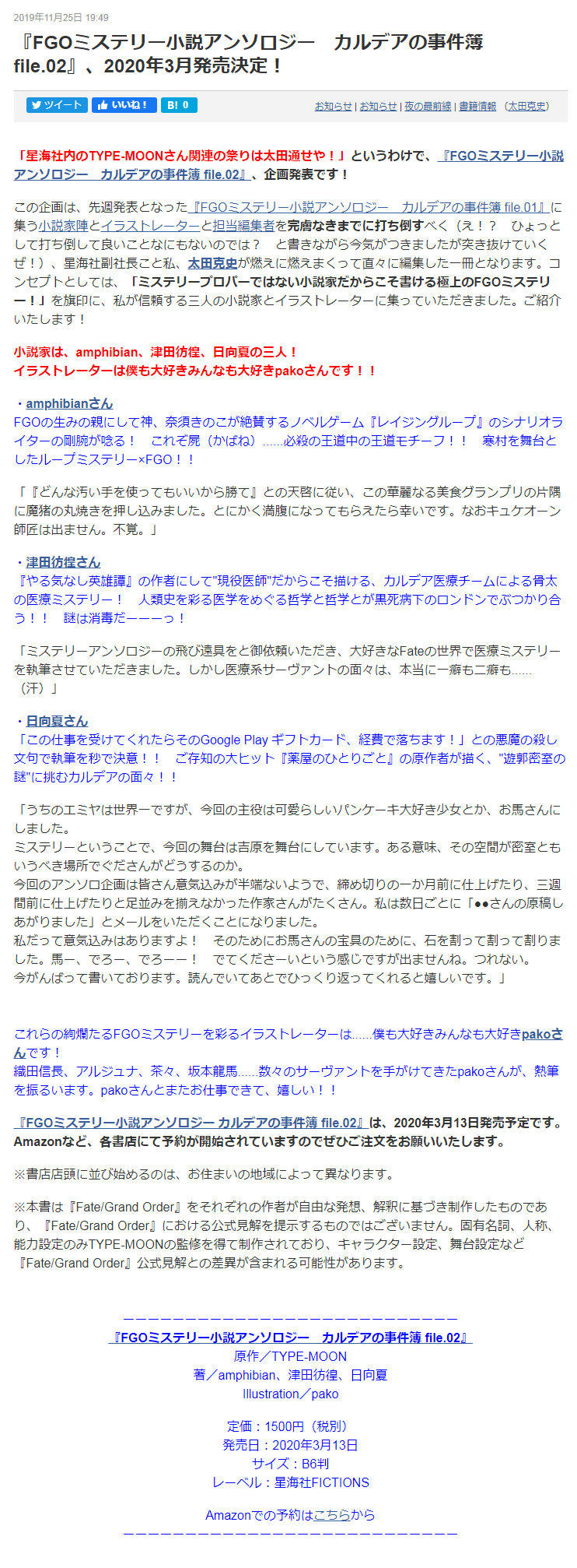 FGOの世界に新たな特異点を降臨させる『FGOミステリー小説アンソロジー カルデアの事件簿 file.02』、pakoさん(@pakosun)の手によるカバーイラスト!