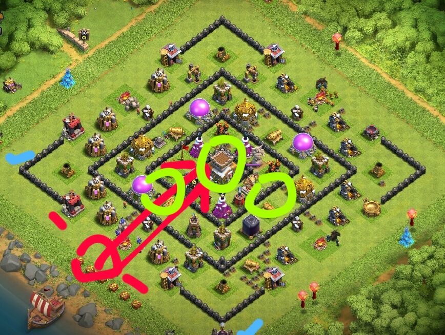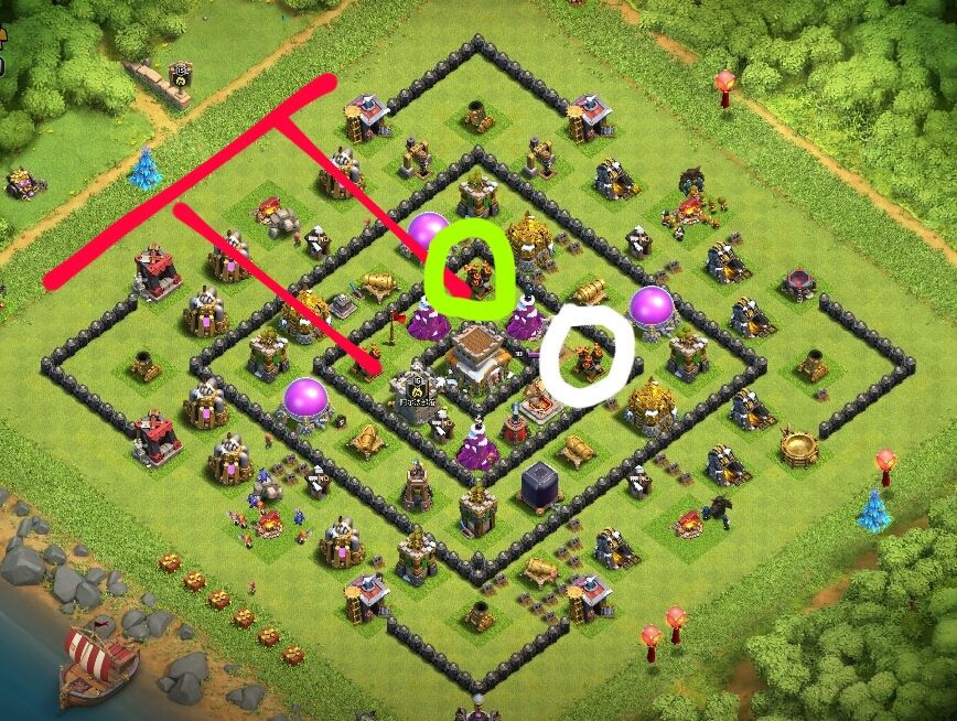 所以这时候带三狂暴是最好的选择,蓝线点龙清边红线大部队,大部队走到第一层墙时下援兵气球,大部队到达绿圈时下狂暴(狂暴的时机自己把握,靠经验积累)