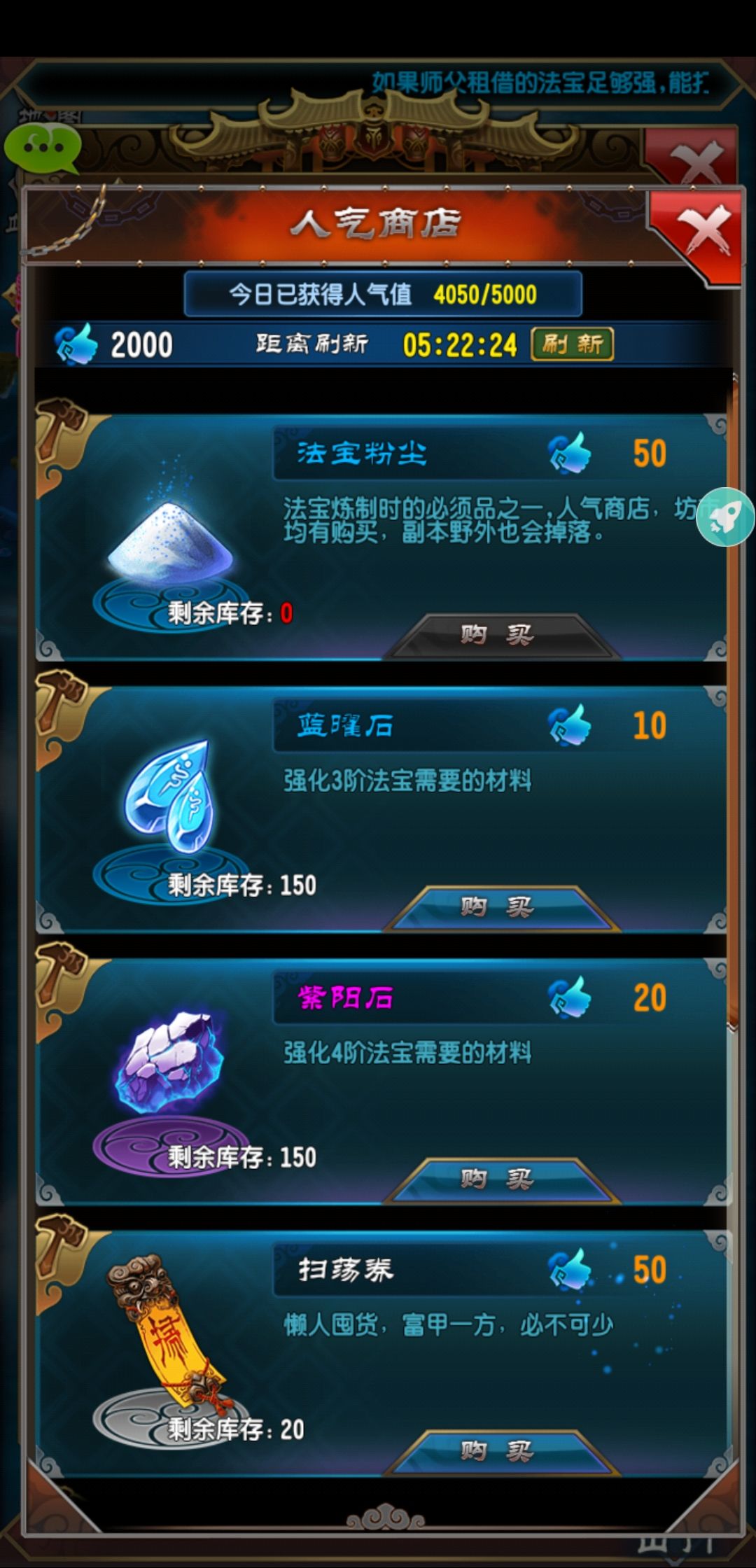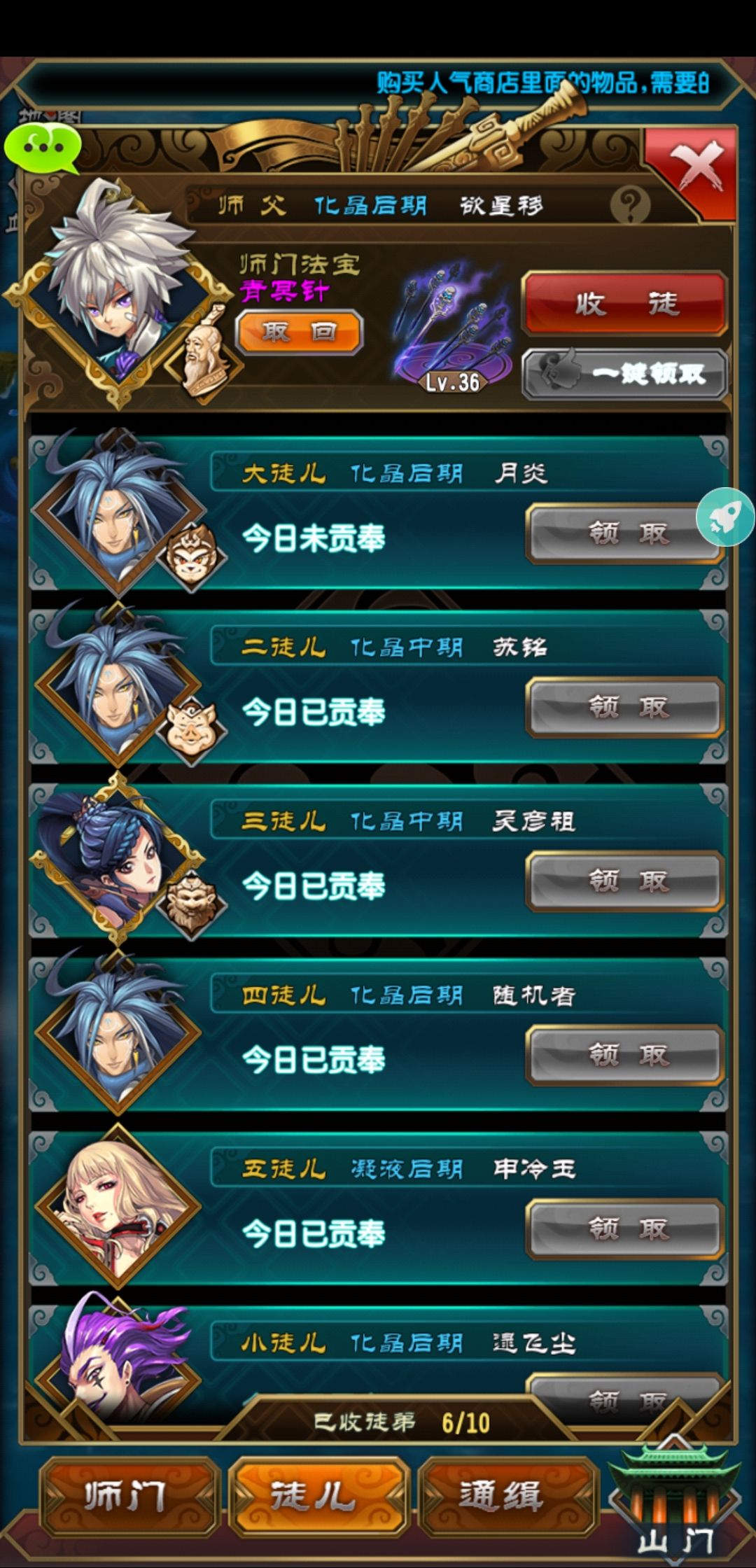 除此以外,师傅徒弟的活跃可以领取人气值,人气值每天上限5k,还是很容易达到的,可以换取的都是非常实用需求量也很大的道具,这里建议换取体力药和法宝粉尘,这俩是怎么都不够用。即使是收取的人机徒弟也会为你提供人气值。