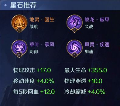 蓝绿星石首选物理攻击和最大生命值来配合尉迟炎的被动技能来兼顾输出能力与生存能力。紫色星石推荐蛟龙,草叶,风灵,大幅度的提升了自身的持续作战能力。