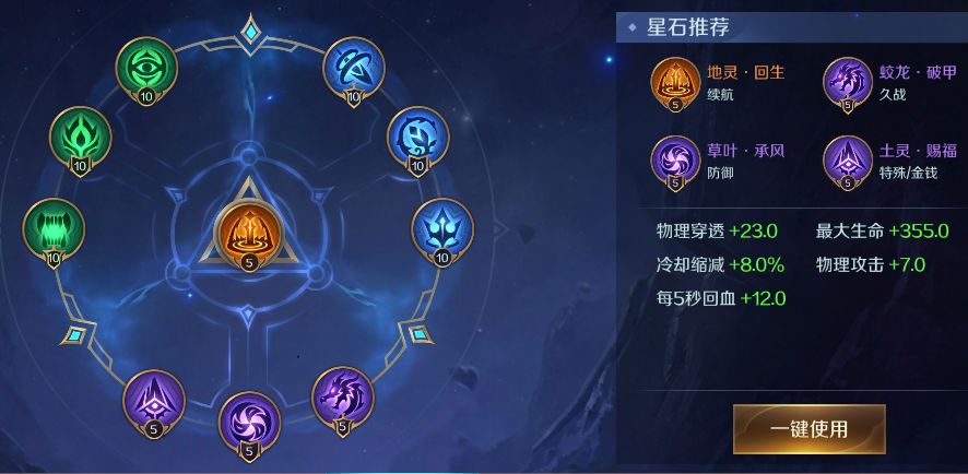 蓝绿星石首选生命值、冷却缩减和物理穿透,提高猪八戒的消耗和生存能力。紫色星石推荐蛟龙,草叶,土灵,保证对线时更好的生存的同时,提升持续输出和更快的发育速度。橙色星石选择地灵,增加最大生命值,增强生存能力。