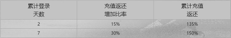1、玩家在内测期间充值的金额将等额换算成元宝,然后乘以按登录天数计算的倍数,返还给玩家,具体的倍数为:
