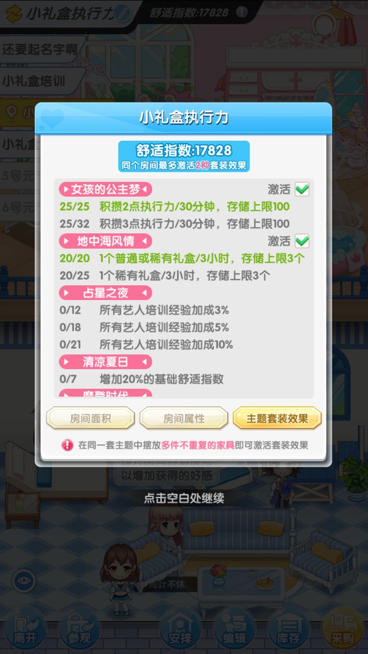 最早小屋的作用就是增加艺人的好感度,这个就不多说啦。然后第二次更新小屋加入了套装效果,每个屋子里最多能同时存在有两种主题套装效果。套装的效果点击小屋最上面舒适指数那个小叹号就能看到啦。现在一共有五种套装。个人认为,增加执行力的是最最最有用的,毕竟大家好才是真的好,防止老板被掏空人人有责。。另外除了执行力,培训或者小礼盒也都是很不错的选择。。