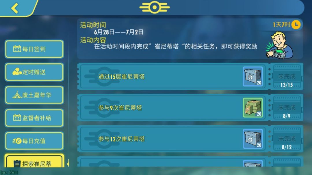 6.能肝图就别扫荡,扫荡只给通关低保。肝图的话,你。。。。会有小怪收益,会有答题大礼包,会开各种保险柜,会遇到宝箱鼹鼠,会瓶盖抽奖,然后重点来了。。。会有宠物掉落,增加300电力/小时的萌宠,你要不要?每天的大型战斗能打的尽量打,10抗辐宁就有一大堆材料,还想怎样?