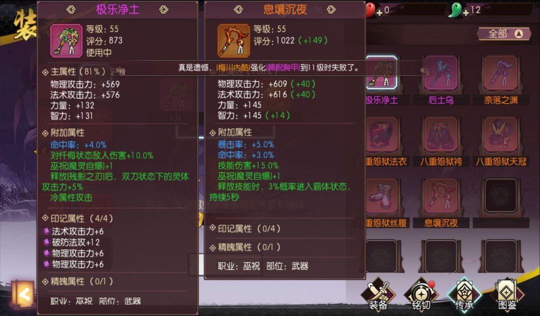 55级的武器推荐极乐净土,个人觉得残影之刃这个技能后期对巫祝来说还是很重要的,而且在攻速加强的情况下还能提升灵体的攻击力,可以说是相当有性价比的粉装武器了。后期武器传承后可以变成55级橙武息壤沉夜。