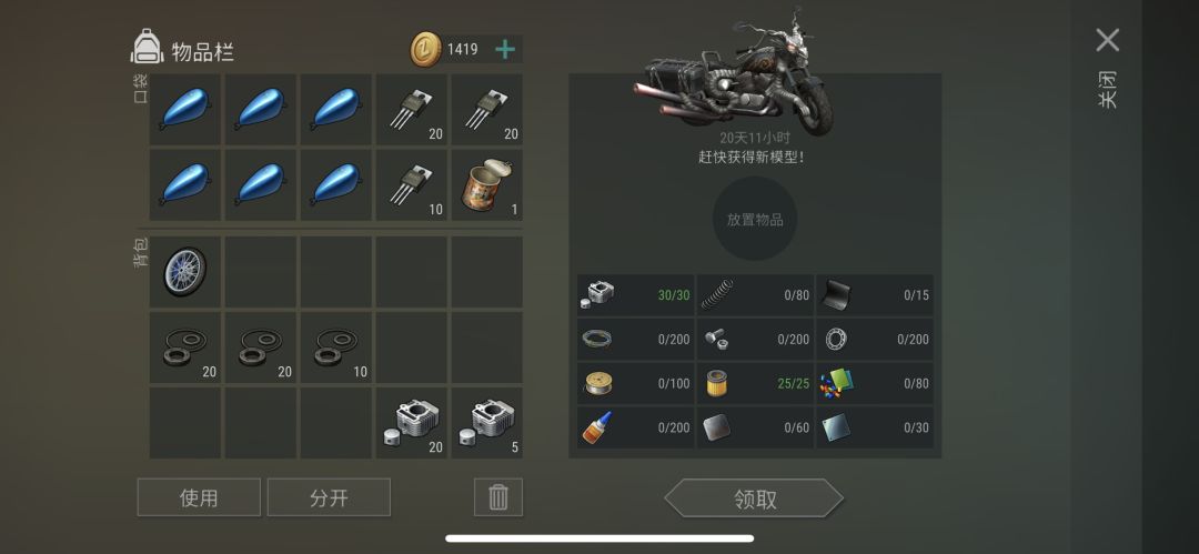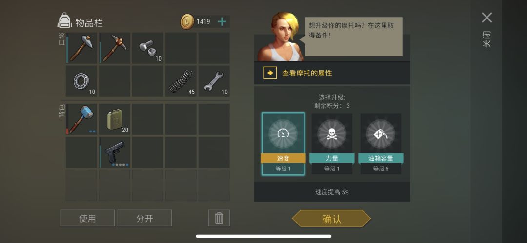 最后,比较坑爹的是,你手上的摩托会变成一级的,也就是只有 2 个格子了。需要到加油站交东西升级。