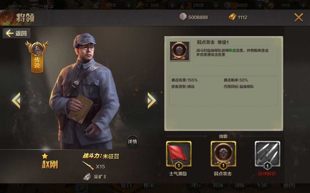弱点攻击:战斗时自身部队获得吸血效果,并有概率造成多倍普通攻击伤害。