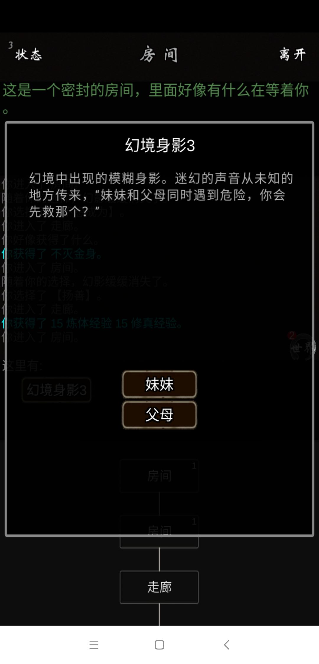 第三个有分歧,我扬善高的时候选妹妹过了(没试过选父母的),杀戮高的时候选父母过了。