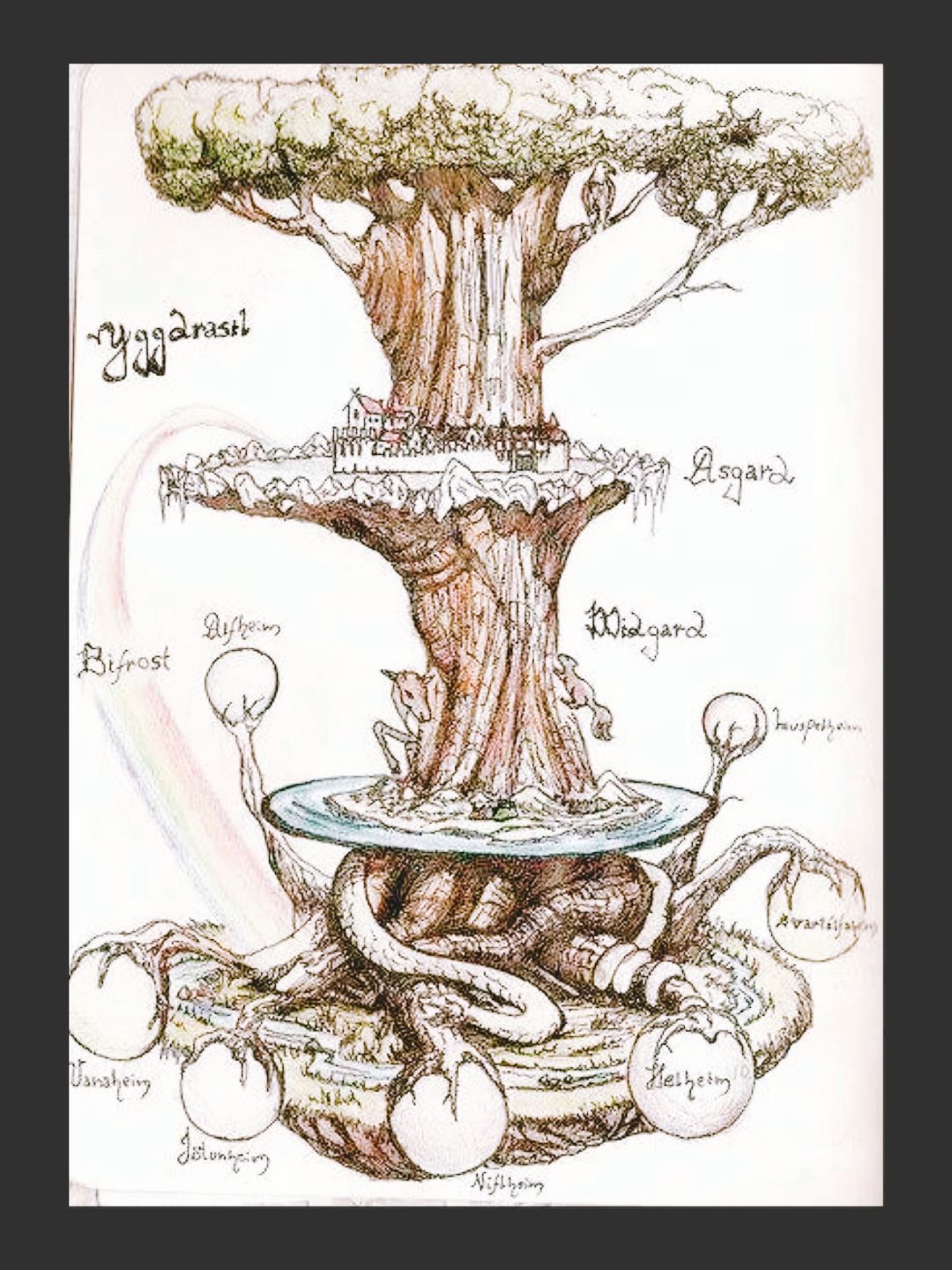 “世界生长于世界树之上,分九大国度与三层世界,我们熟知的阿斯加德(Asgard)位于世界树顶端,住着奥丁与阿萨神族,