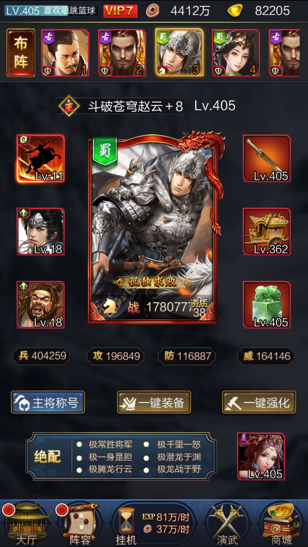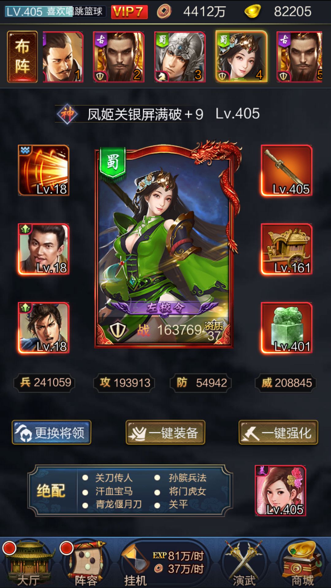 到了400级,传统武将的输出已经严重不足了。这里就需要新的输出型武将了。所谓神豪用薛仁贵,土豪用张春华,屌丝用关银屏(关银屏必须400级9阶才能使用,前期无用)。关银屏作为唯一的一个连击+攻击增加特性的武将,虽然技能不是群攻弱于其他2人,但是非常适合屌丝的我们。不管你有没有充钱,玩到400级肯定是有关银屏的。