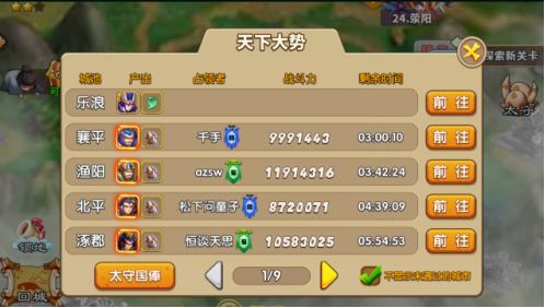 小技巧【在占领关卡期间内,每分钟都会获得奖励,如果自己不小心撤离了关卡,或者被其他玩家击退后,需要等待300秒才可以重新占领或挑战这个关卡,占领其他关卡没有冷却时间,初期的话如果太守是一个很好的收集武将的设定,玩家可以选择自己已有的武将进行镇守,尽可能的多积攒碎片来提升武将品质。】