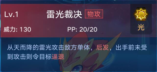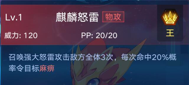 这个技能威力不错,削弱双防和清除强化在PVE中有非常不错的表现,PVP中强大的威力也是秒杀的存在。大招相对来说没有1技能来的出彩,还有个缺点就是动画实在是太慢了,看的很烦。另外麒麟的大招施放很看技巧,在非单挑场合,如果麒麟特性是雷电王谕,请注意留大等对方麻痹后使用,Aoe续航在对面人数多的时候比放一个大招管用的多。