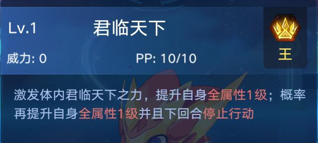 全亚比技能中为数不多的全属性提升,全+1无负面,全+2停止行动一回合,即使背上了负面,也拥有了全属性加2以后的效果,闪避和防御都有大幅度的提高,完爆神武月战无炎,这给麒麟提供了强大的PVE能力,由于目前的PVP环境并不是强化推队,并且这个技能有负面效果,所以它带来的PVE效力是强于PVP的。