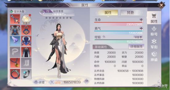 通过点击主界面左上角的人物头像可以进入到属性界面,在属性界面中我们可以看到人物的外形、已经佩戴的装备、修为、生命、真气以及一些基础属性。同时,在属性界面右侧的菜单中,我们还可以选择查看自己获得的称号、军衔以及神谕。